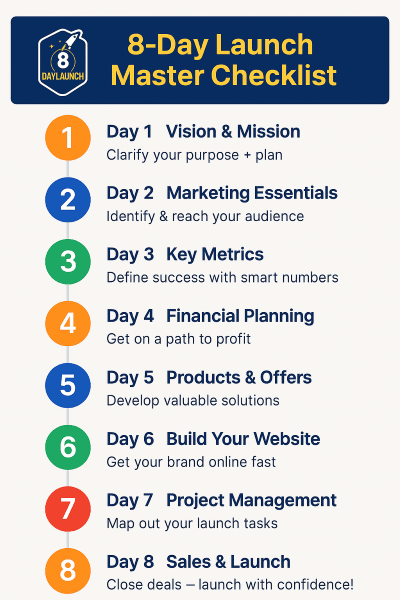 Instantly receive a FREE 8DayLaunch Master Checklist - with every action step organized by day?